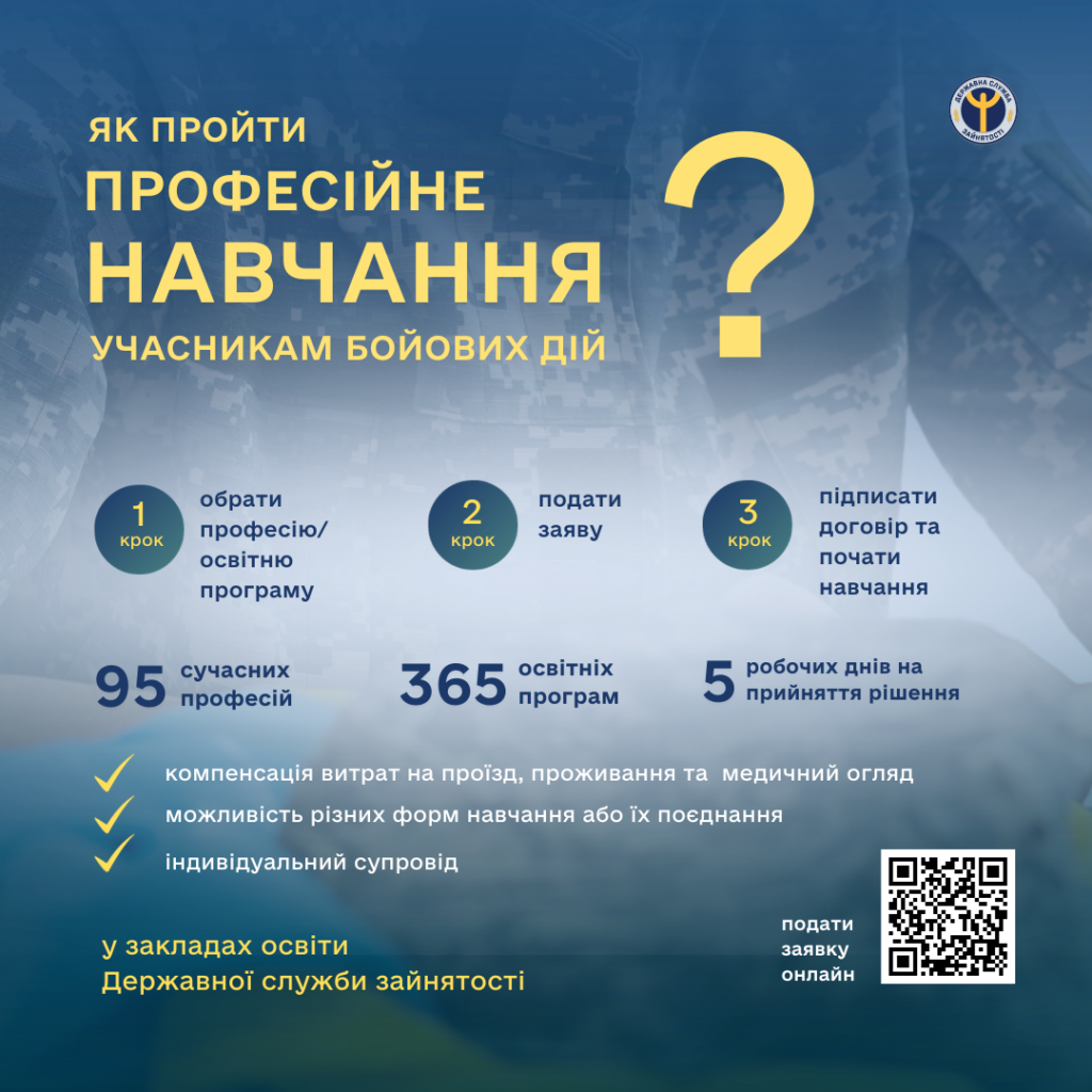 Учасники бойових дій та люди з інвалідністю внаслідок війни можуть безкоштовно пройти професійне навчання в Центрах професійно-технічної освіти Державної служби зайнятості. На вибір – 95 професій та 365 освітніх програм.