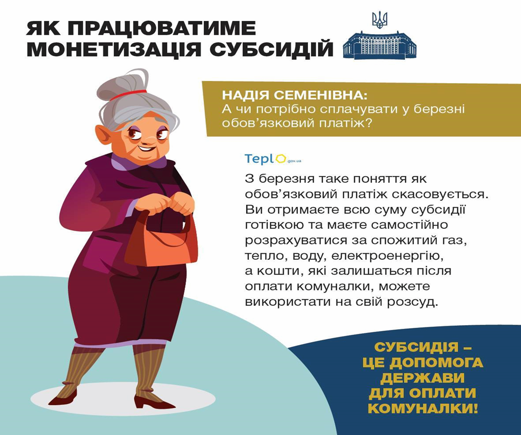З березня таке поняття як обов’язковий платіж скасовується. Субсидіанти отримуватимуть всю суму допомоги на руки і мають самостійно розрахуватися за спожитий у лютому газ, електроенергію, воду та тепло. Монетизована субсидія, яка залишиться після оплати комуналки, може бути використана на власний розсуд домогосподарства.