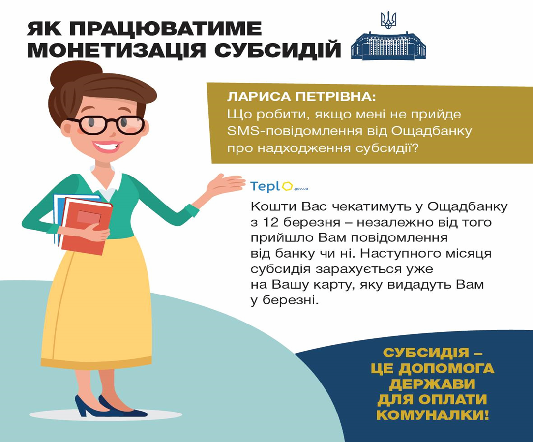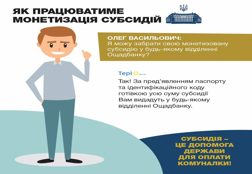 Р.S. Для того, щоб поінформувати кожного одержувача про нововведення, передбачено надіслати кожному на поштову адресу персональне повідомлення, в якому буде зазначено розмір субсидії, а також спосіб виплати (для пенсіонерів) або необхідність звернення до відділення Ощадбанку (для тих, хто не отримує пенсію). Крім того буде надано інструкцію щодо використання коштів субсидії на оплату житлово-комунальних послуг та наголошено на необхідності своєчасно сплатити за послуги, оскільки наявність заборгованості унеможливить призначення субсидії на наступний період.