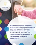 З метою поліпшення соціального захисту осіб з числа дітей-сиріт і дітей, позбавлених…Читати далі Верховною Радою прийнято Закон України щодо посилення соціального захисту осіб з числа дітей-сиріт, дітей, позбавлених батьківського піклування, які мають інвалідність